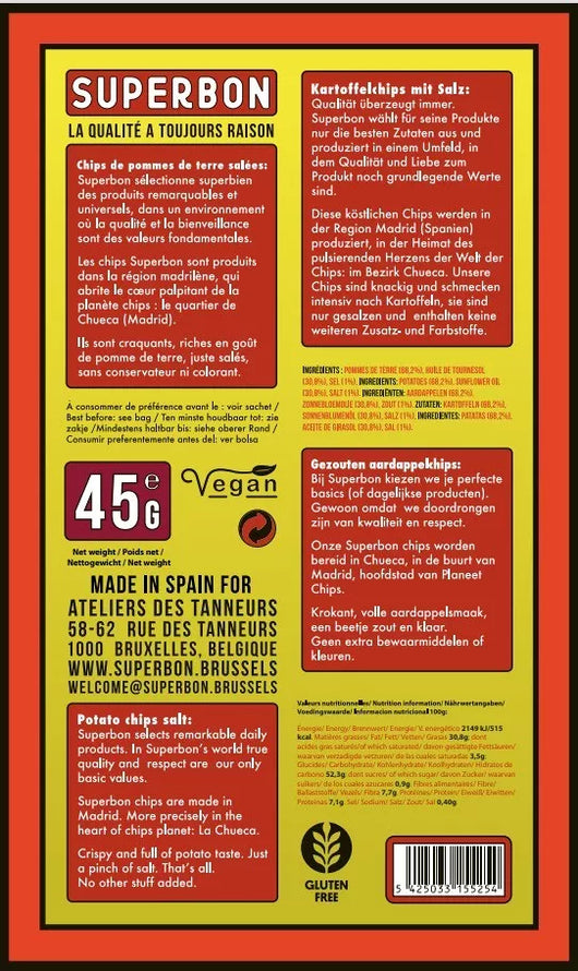 Ven y descubre una receta esencial producida en el país de las papas fritas: España. Nuestra diferencia? Solo 3 ingredientes: papa, aceite de girasol y una pizca de sal.