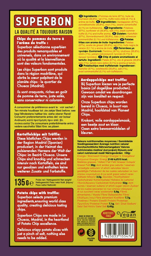 Pommes de terre (67%), huile de tournesol (30,8%), sel (1%), truffe noire d’été (0.1%) & arôme de truffe.