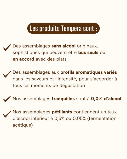 Met Tempera bedoelen we gematigd, voor het milde klimaat van Menton. Matigheid, want onze drankjes zijn alcoholvrij. Temperament, omdat hun unieke aromatische profiel je zal verrassen.